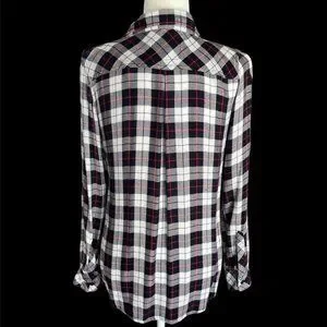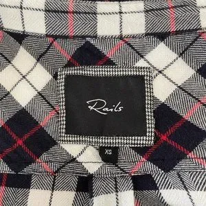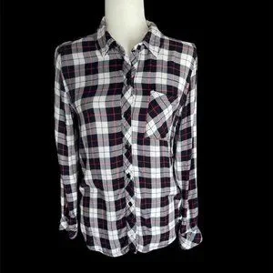 Rails Women’s Size XS White, Black, Grey & Red Pin-Stripe Plaid Long Sleeve Button Up Shirt.