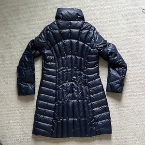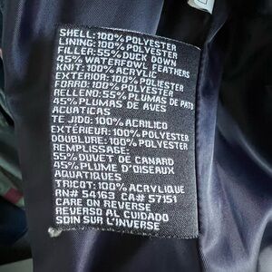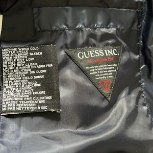 Guess navy blue women’s puffer jacket. Falls to mid-thigh. Size M. 2 interior pockets. Hardware is silver-it looks good in the pictures. 100% polyester. Filler is 55% duck down and 45% waterfowl feathers. Very warm.