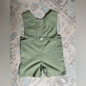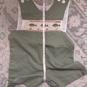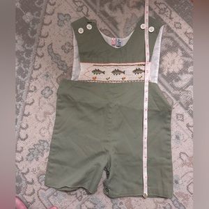 Olive Green John John with smocked Fish across chest