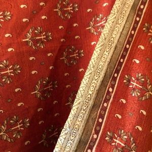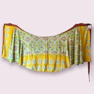 Short layer in a gold trimmed, rust colored micro floral. Long layer is beautiful sunny yellow & spring green tye dye with bandhani surrounded circles.