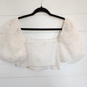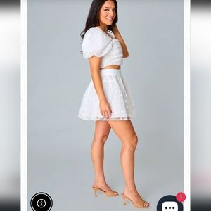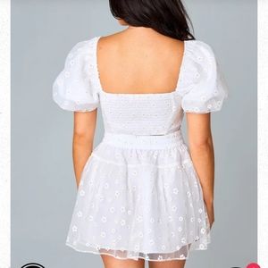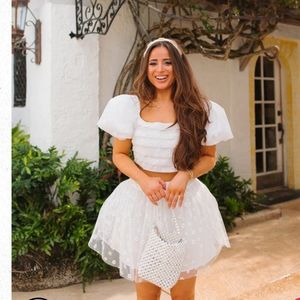 Grab a glass of bubbly and get ready to celebrate all night in the Cutie Set! The Cutie Set features a puffed sleeve pleated cropped top with a smocked back panel and an elastic back flowy skirt. She's a part of our Meghan Nicole xx BuddyLove Bridal Collection, and perfect for all you brides!
