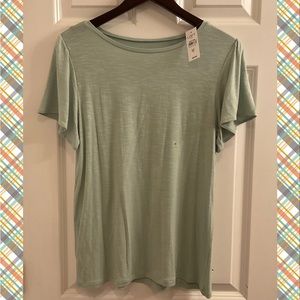 This is a brand new with tags LOFT Outlet Rayon Blend Short Sleeve Top. Size medium. I would describe the shade as mint. The sleeves have puff details. 96% rayon, 4% spandex.