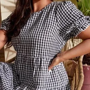 Classic Plus Size Gingham Puff Sleeve Ruffle Hem Smock Dress
