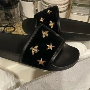 Authentic Gucci velvet slides with bee/star embroidered emblem