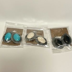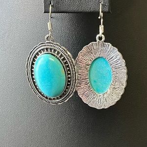 Oval Metal Semiprecious Stone Fishhook Silvertone Fashion Earrings.