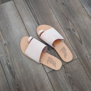 Ancient Greek Sandals - light pink suede slip-ons with support around the big toe. very comfortable and excellent condition. Size 37, which is usually a size 7