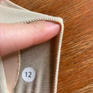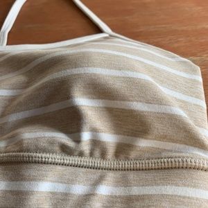 Lululemon Striped Sports Bra Size 12 ALTERED PLEASE READ DESCRIPTION. So I bought this from a thrift store not realizing it was an altered size, and unfortunately it doesn't fit. This is a cute beige and white striped racer back sports bra with cups. The size is 12, but it has been cut and sewn. The good news is, whoever altered it did a great job, the bad news is, who knows who this will fit? I've taken approximate measurements while the bra is lying flat and unstretched. The measurements are.. across bottom band 13.5"... top of shoulder to bottom of bottom band 12.5"... pit to pit 15"....bottom of strap to bottom of band 8"... strap from top of shoulder to top of bra 4.5"... If you have any questions, please let me know so we can ensure this will fit you because of course you cannot return because of wrong fit on this app.