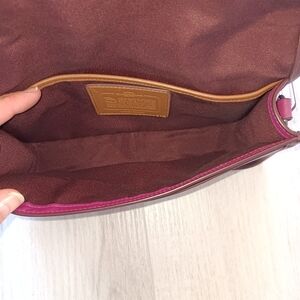 Coach Penny Bag, a 75th anniversary limited re-edition of a signature bag called the Dinky from the 1970s. Deep pink magenta colored leather with a full shoulder or crossbody strap. One exterior open pocket and two interior open divider pockets. Top flap closes with a metal knob.