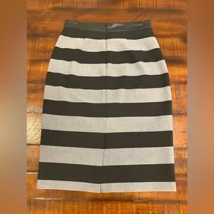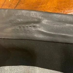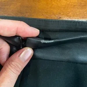 See photos for a couple of issues. 1. Pleather at waist has imprints from skirt hanger 2. On back, pleather has peeled a bit in one spot at the top of the waist band by the back zipper. Otherwise in excellent condition.