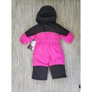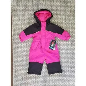 New, baby/toddler snowsuit. Size 12 months, pink and black. Fleece lined, thick and warm. Velcro pockets, velcro over main zipper. Elastic inner lining at ankles, zipper boot cuffs for easy on. Velcro wrist cinch.