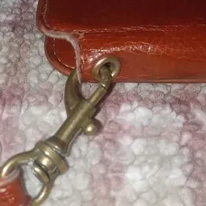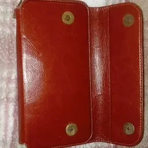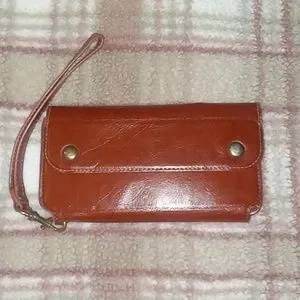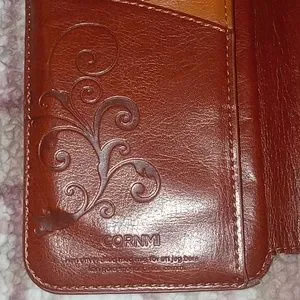 Very beautiful, carmel brown, womens leather wristlet. Beautifully made by Cornmi!! This is a used leather wristlet but it's in excellent condition, w/o tags! It is trifold with one zipper pocket on the outside & the main compartment is snap closure. Inside 6 card slots, & 2 additional pockets for cash or whatever. I'm not really sure what's up with the velcro strip on the inside. There may be a missing piece. But this is exactly how I purchased it 2nd hand!! It does have a strap attached by a metal brass musketin. The outside zipper pull says Cornmi on it. This is a very unique piece. I've never seen another one like this or even remotely similar to this wristlet. It really is a must see to appreciate!! Its beautiful carmel color & the design on the inside is so dainty & it's just a beautiful addition to any woman's accessory closet.