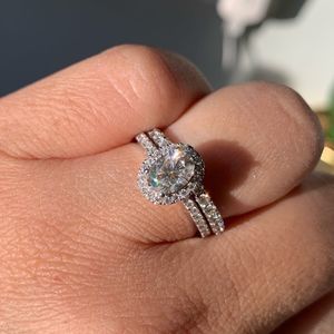 14 accent diamond quality moissanite cascade down the top of the 14k white gold polished engagement ring band, while 18 more diamond quality moissanite form a halo shape around the oval center stone •From a side view, you can see that the main stone and accent moissanite are raised, giving the ring a little extra unique feature, and leaving space for the wedding band to fit snug up against the engagement ring.