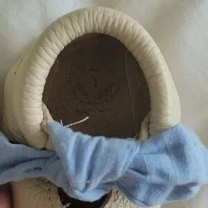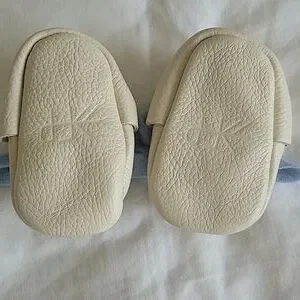 excellent condition. Dust bag included. cream leather. blue cotton bow. seem on the wider side.