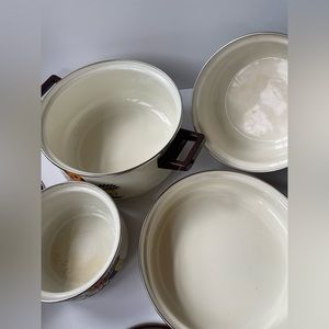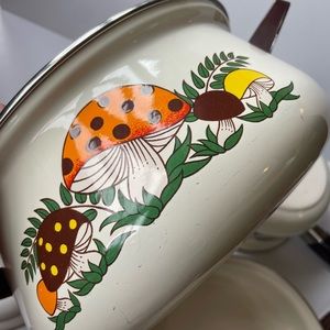 Vintage 1970s Sears “Merry Mushroom” enamel pots and pans set with lids, set of 4. This highly collectible set is in great condition. Some wear on the pots including small marks in the outside enamel and pattern, some wear from use inside the pots themselves, and overall wear (please check out the photos). Please message with any questions 😊