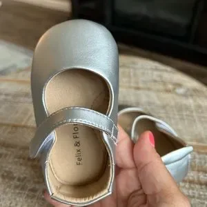 Brand new silver dress shoes for baby girl. Velcro strap. Back of shoe has a lot of give- there is elastic..see last picture. Measurements are from another country so I took pictures of the measurements. I estimate it to be near a baby size 5. Brand new without tags!