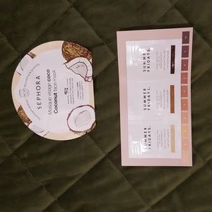 Total of 10 different samplers consist of: Shephora Coconut face mask, Grip Primer, Fresh Lotus youth preserve dream face cream night recovery, Saie Glowy super gel, forget the filler lip plumping, Sumner Fridays 3 different shades, Caliray free dreaming skin wellness diffusing tints, Westman Atelier clean glow trio, Kosas glow I.V. vitamin-infused skin Enhancer,MERIT the Minimaliste complexion perfecting stick it is not a foundation or concealer, but it replaces both in your makeup bag.