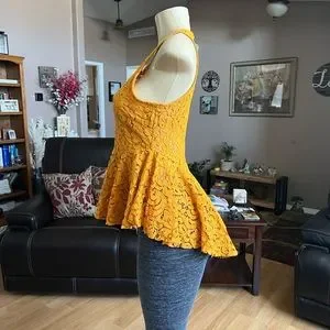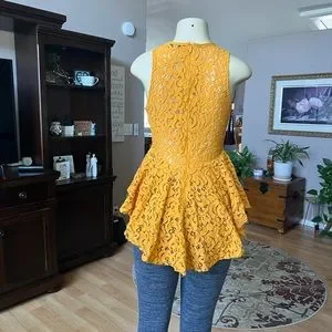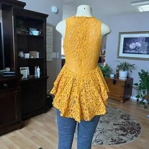 Haute Monde gold crochet type material sleeveless blouse. Zipper in the back at about the waist all the way up. The back is longer. Says it’s a size L, but more like an M with the measurements. Armpit to armpit is 18 inches, length is 29 inches. Material is 60% cotton, 40% nylon. In brand new condition. Waist is a little tighter and then flares out.