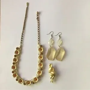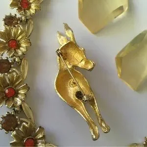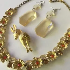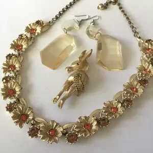 Tags: cottagecore, Boho, Bohemian, donkey, horse, gold, orange, brown, red, resin, chain, metal, daisy, flower, figural, geometric, choker, JJ, Jonette, Vintage, VTG, Costume, yellow, facets, faceted, facet, dangle, rhinestone, garland