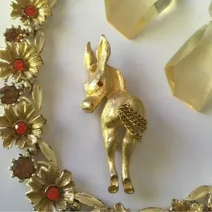 1. Adorable vintage Jonette Jewelry Company ( signed JJ ) gold toned donkey brooch with moveable chain tail and red stone eye.