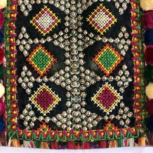 Unique and gorgeous, amazing details - crystals and metal beads and cross stitch and mini pom poms - omg I’ve never seen something like this! All the trims at front are real deal but at the back it’s just graphic print. So special and interesting! Hard to come by.