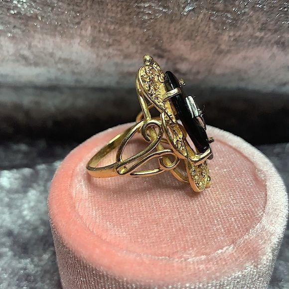 Are not able to find similar or very rare ring. Vintage from 1800’s this was purchased at antique shops. Very beautiful with pure onyx solid 14kt yellow gold weight 5-8grams size is between 6.5 to 7 us. Stamped 14kt