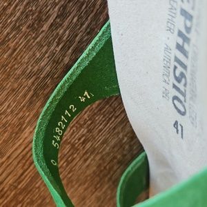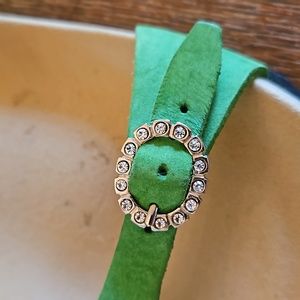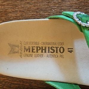 Mephisto Idelya Sandals, lime green color, Size 41. These Mephisto sandals have beautiful, buttery soft suede leather straps embellished with rhinestone buckles. The soles are made of shock absorbent material. They have AIR-RELAX technology and, according to Mephisto's site, this respects the anatomy of the foot to prevent fallen arches. These sandals were only worn once and the bottom of each shoe does not show wear. Made in France.