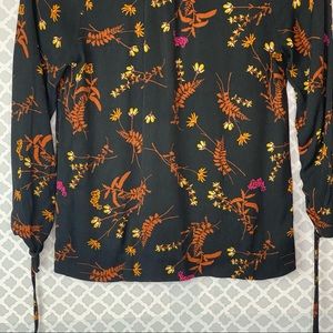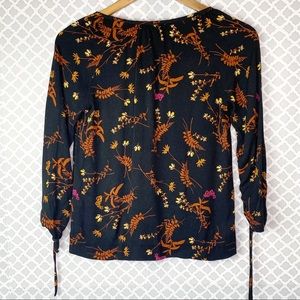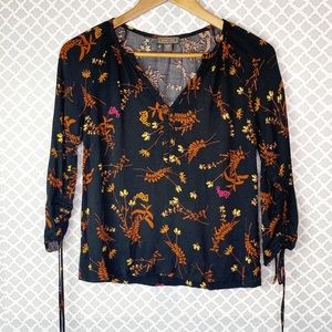 EUC Point Sur Drapey Black Floral Open V neck Top-popover styling, split V neck, ruched sleeve, slightly