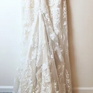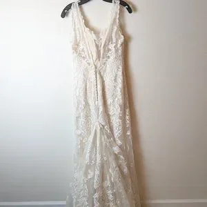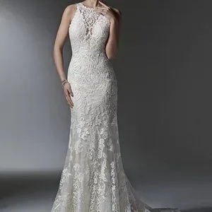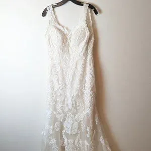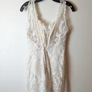 Sottero and Midgley Winifred gown, size 10. Lining is ivory and the lace outer is white. Fitted sheath dress that flairs around the mid-thigh.