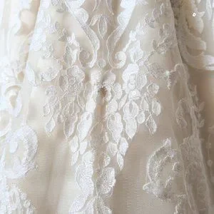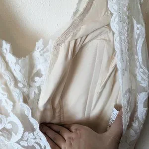 Note, this dress has been altered! I don't have a complete record of all the alterations that were done to the dress. But from what I can tell, the front of the dress has had the neckline changed. The neckline of this dress is NOT as pictured in the manufacturer's photos. This dress has had the lace cut down into a V that more closely follows the contour of the lining. The bust area appears to have been darted. There is also an ease stitch along the V of the bust/plunging neckline. There is a 1 point traditional bustle that has been added. The shoulder straps look to have been raised slightly. There is a tear in the right shoulder strap. This is pictured in the last two photos; in one of the photos, I am showing the hole by poking my finger through it, in the other photo, I am showing what it looks like without poking through it. There may be additional alterations to the dress that I did not notice. By purchasing, you agree that you are buying the dress AS IS, and that you are aware of the alterations disclosed, as well as the possibility of additional alterations that I have not noticed or mentioned here.