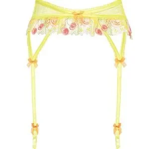 The prettiest way to squeeze more fruit into your day? A cheerful garter belt embroidered with a colorful arrangement of cherries, lemons, pineapples, and lemons on its ruffled waist. Sheer dotted mesh panels enhance the sweetness.