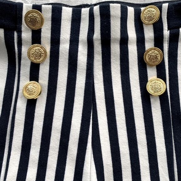 Forever 21 size S navy and white high waisted striped sailor shorts, gold buttons, cozy stretchy fabric, left back bottom hem has loose stitch, easy fix, see photo, good condition