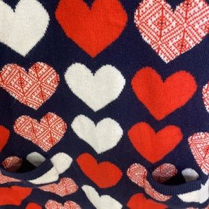 EUC Tucker & Tate heart sweater dress with 2 front pockets, little girls size 4. Super adorable and provides much warmth! 95% cotton, 5% cashmere. Unstretched pit-to-pit: 11 inches. Neckline/shoulder-to-hem: approx. 19-20 inches. Colors: navy blue, red, white.