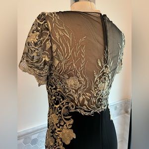 Marchesa Notte Mermaid Black Stretch Crepe and Gold Lace Embroidered Ball Gown 8
