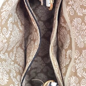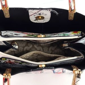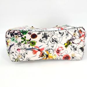 White Green yellow red floral dragonfly hand bag gold accents. lots of pockets.