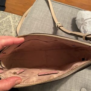 Beautiful blush pink bag that is like new with no flaws! Interior has both slip and zipper pockets. Exterior has large slip pocket. Measures 9 1/2” x 7”x 3 1/2” with adjustable strap. Smoke-free home!
