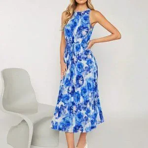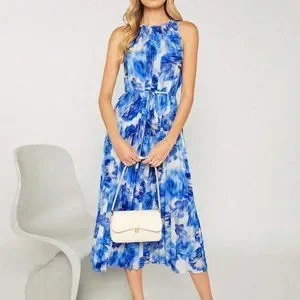 Blue Boho Womens Allover Print Pleated Belted Dress