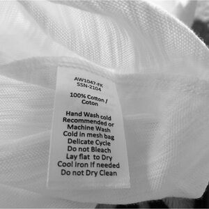 Hand wash cold recommended or machine wash cold in a mesh bag on the gentle cycle. Do not bleach. Lay flat to dry. Cool iron if needed.