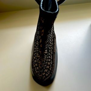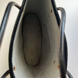 Super sassy tribal gold pattern black tote purse with suede leather lining. In good vintage condition. Measures roughly 10” H x 10” W. Tiny little pocket on the interior.