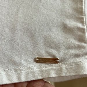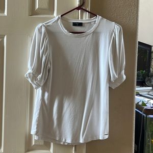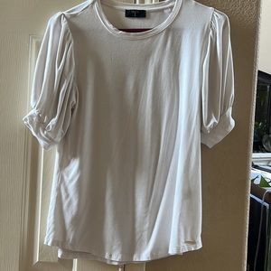 Tahari off-white T-shirt with bunched sleeves. Size medium. Kind of formfitting except for gathered sleeves. Super cute, dressed up or dress down.