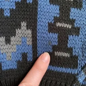 Flaws: Small spot on back of left sleeve. Other normal wear/piling