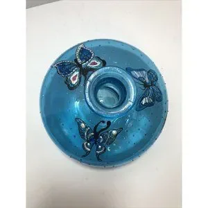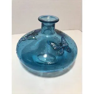 Beautiful Aqua Blue Glass fat vase with butterflies 9.5" Dia. Teal Blue Green
