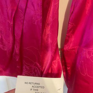 With an easy, wrap-around shape and a cleverly draped waist that creates an ultra-flattering silhouette, Paloma is an effortlessly cool, love-forever mini dress. Crafted from a bold floral jacquard in a brilliant shade of hot pink, her feminine overtones are offset with a masculine collar and exaggerated cuffs that can be buttoned back or left loose to move as you move.