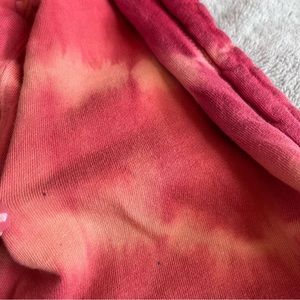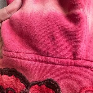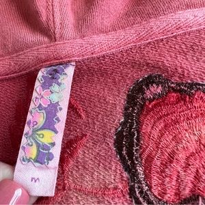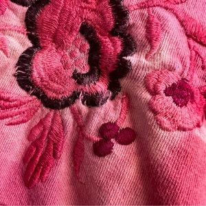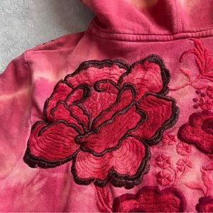 Great used condition. Floral Embroidered Tie Dye Hoodie by Free People in pink with red, black and white detailing. Bohemian lounge aesthetic. Hooded sweatshirt with full zip-front closure, long sleeves and drawstring hood. Kangaroo slip front pockets. Allover tonal romantic boho floral embroidery and tie dye fabric finish, see video. Manufacturer-intended distressing, including exposed seams at each sleeve. Note: light wear throughout, with a few pulled threads at embroidery and light discoloration (blends into tie dye), see photos. Size medium, see photos for measurements.