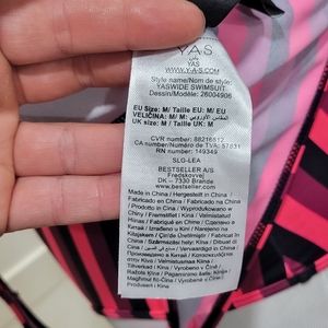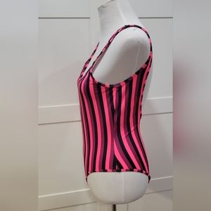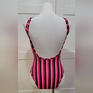 - Description: Black purple and pink vehicle striped swimsuit. one piece. no shelf bra. scoop back. bathingsuit.