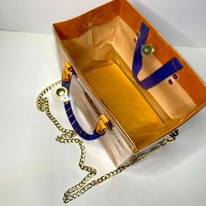 The upcycled tote bag isn't an original Louis Vuitton product, but rather, it's creatively crafted using a Louis Vuitton gift bag. Covered with a clear PVC layer for increased durability. For added luxury, the bag is fastened with faux leather handles, and gold-toned rivets. Straps are decorated with authentic LV ribbons! Gold link chain strap has been added to the sides of bag if you want to wear it on your shoulder.