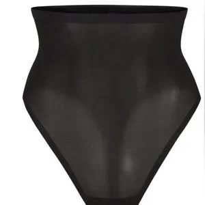 NWOT SKIMS Sheer Sculpt High Waist Thong; Onyx; full coverage smoothing & targeted compression for waist/tummy, ultra-high fit that sits underneath your bra line; thong back; Light Level Core Compression Sits Below Bra Line, Bonded At Waist, Merrow Stitch At Leg Opening, Thong Back, Cotton Gusset; Materials: Nylon & Spandex blend; Machine Wash Cold; possibly size up or shape wear/sculpting items and aren’t familiar with the brand items may be very fitted; Intimates are final sale; no exchanges or returns.