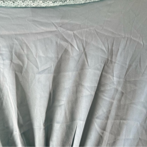 Lace trim around bust and neckline, puffy sleeves, v-neck, buttons down dress, two toned blue, soft material. Slight signs of wear as seen in last couple of photos.