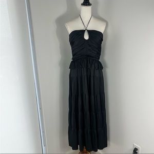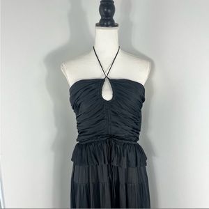 The Evanthe Dress is cut in liquid-like plisse satin, transformed in a bright shade of Goldenrod. This flattering bodice has gathered ruching throughout and a slender keyhole opening at the base of the halter neckline. Features a tiered skirt with gathered seams that add lightweight volume. This dress is unlined and features a side seam zipper. Composition: 100% Polyester.