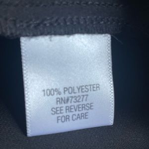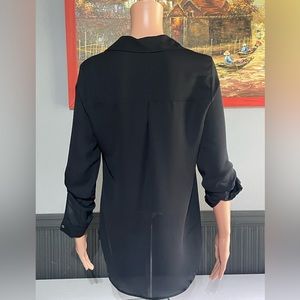 Long sleeve v neckline button down blouse. Cut out pattern across the shoulders on front. Pockets on the front. Made of 100% polyester and in great used condition.