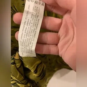 Round neck, 3 gold button closure at the back, 1 button at the left sleeve is missing